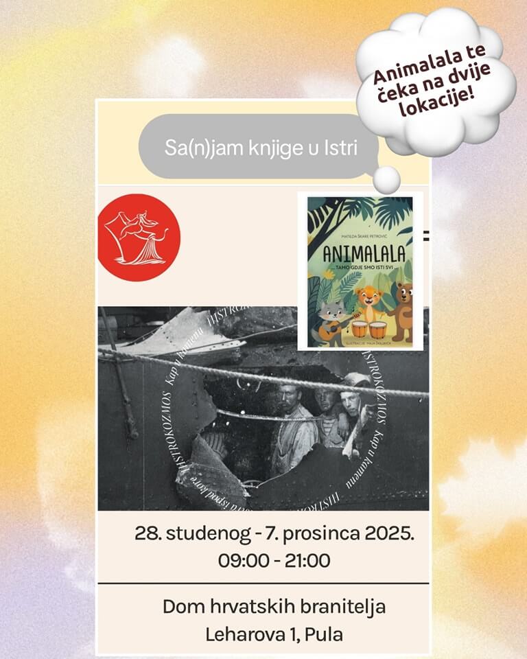 Na ovogodišnjem sajmu u Puli zaokružili smo kraj 2025. godine i sudjelovali na posljednjem sajmu knjiga. Animalala se našla prvi put na ovom sajmu i to na dvije lokacije. U standardnoj postavi Splitskog kantuna, ali i na policama Izvrsnih priča (Pogled u drugi svijet).